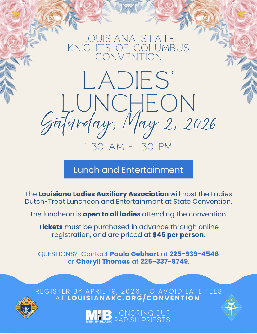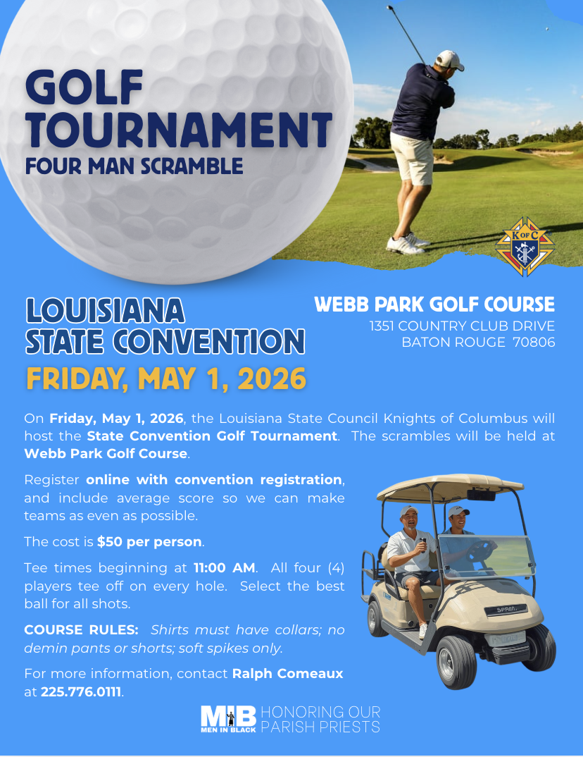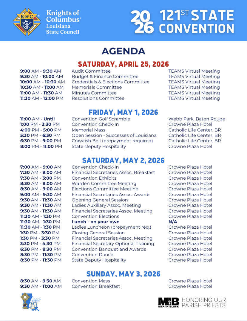 The Louisiana State Convention brings members from all over the state to enjoy a fun, family-filled weekend held in the first weekend of May every year. Attend our Convention and support charitable programs, strengthen your Catholic faith and values, connect with other members and their families, and participate in the business meetings. The Louisiana State Knights of Columbus Convention offers opportunities to engage with the organization's core principles of Faith, Fraternity, and Charity, while fostering a sense of brotherhood among members.
