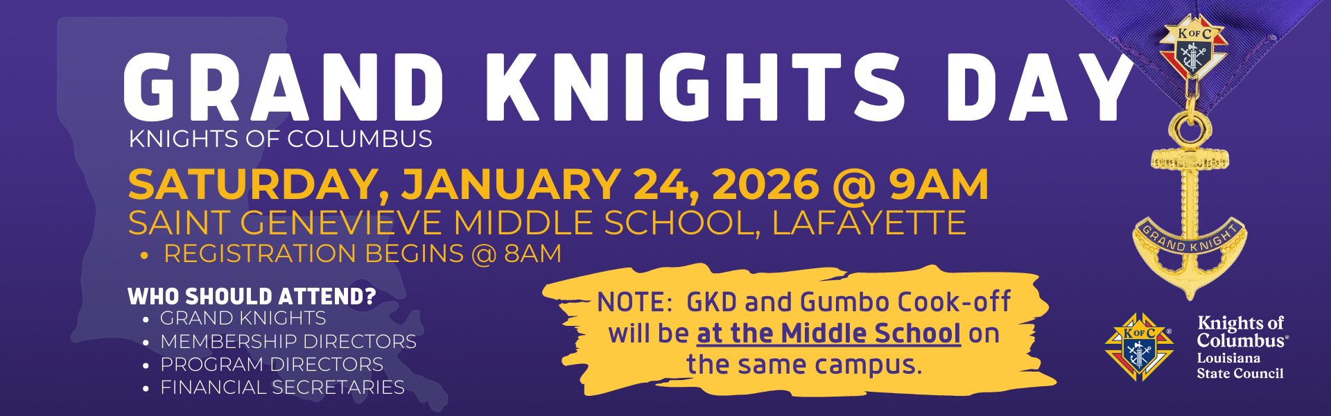 On Saturday, January 24, 2026, Grand Knights Day will be held at Saint Genevieve Middle School (on the campus of Teurlings Catholic High School, located at 91 Teurlings Dr, Lafayette, LA 70501.  Registration begins at 8:00 AM.  The meeting starts at 9:00 AM.