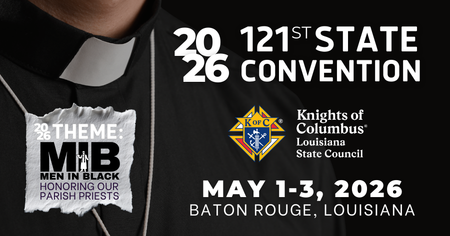 The 121st State Convention of the Louisiana State Council will be in Baton Rouge, Louisiana, from Friday, May 1, 2026, through Sunday, May 3, 2026. Registration is open, so check out LouisianaKC.org/Convention to read about the Convention, LA Successes, sponsorship opportunities for your councils, and more!